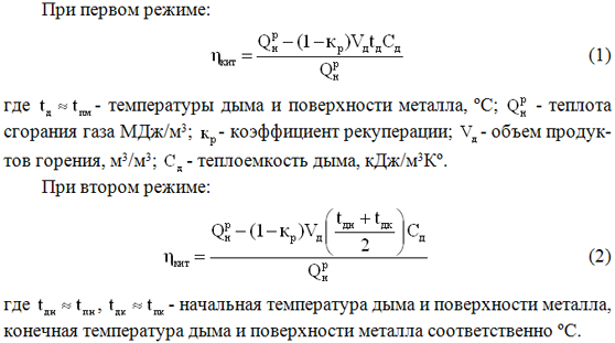 Известно, что суммарная тепловая мощность печи состоит из полезной тепловой мощности (Мпол) и мощности холостого хода (Мхх). Мощности рассчитываются с использованием значения КИТ, следовательно, изменение величины КИТ влияет на полную тепловую мощность печи, которая впоследствии определяет значение КПД и расход топлива. Полученные в результате расчетов значения свидетельствуют от том что режим q=const (при этом же режиме tд имеет минимальное значение) более эффективен с точки зрения экономии топлива. Недостатком при этом является значительная продолжительность нагрева и высокая окисленность металла.