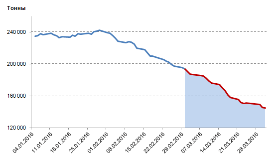 Запасы меди на складах LME в марте снизились на 25% или 48 725 тонн с 193 475 тонн на 1-ое марта до 144 750 тонн на 31-ое марта, достигнув минимальных значений с начала 2016 года.