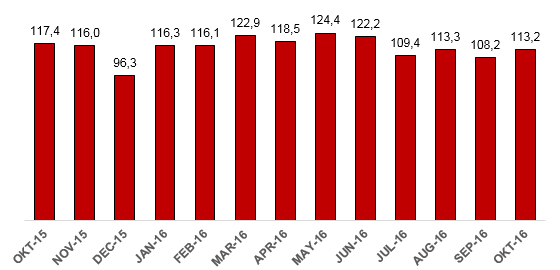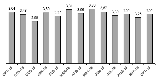 Среднесуточное производство стали в октябре 2016 года выросло на 5 тыс. тонн или 4,66% к сентябрю 2016 года, с 108,2 тыс. тонн до 113,2 тыс. тонн.