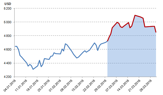 В марте цена меди на LME (London Metal Exchange) выросла на 2,7% или на 129,5 USD/т с 4 726 USD/т на 1-ое марта до 4 855,5 USD/т на 31-ое марта. Максимальная цена была достигнута 18-го марта и составила 5 103 USD/т, ценовой минимум наблюдался 1-го марта и составила 4 726 USD/т. Диапазон колебаний цен в марте составил 377 USD, среднемесячная цена 4 947,55 USD/т, а ее прирост к предыдущему месяцу составил 7,7% или 352,07 USD/т.