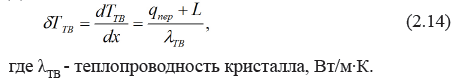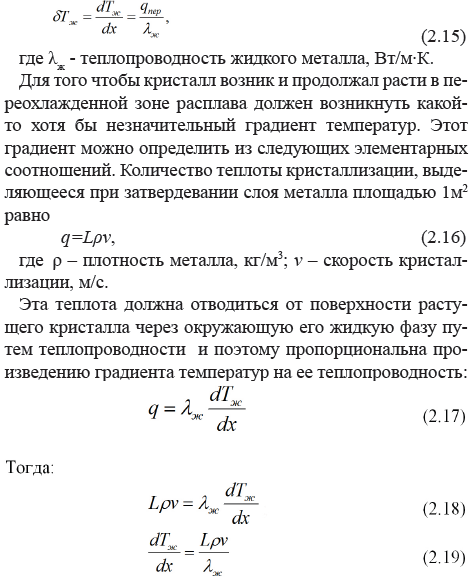 Вместе с тем, приведенные выше способы решения задач кристаллизации предполагают, что жидкий металл в изложнице имеет температуру ликвидуса и не учитывают возможность его перегрева или переохлаждения. На практике же рост кристаллов происходит при наличии температурного градиента Т, обеспечивающего отвод теплоты перегрева qпер, поступающего к границе затвердевания, и теплоты плавления L.