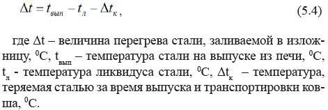 Величина теплового потока, который подплавляет корочку слитка, зависит от перегрева жидкой стали, заливаемой в изложницу. Среднюю величину этого перегрева определяют по формуле: