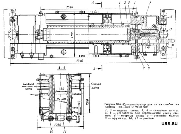В качестве примера на рисунке 20.6 показана конструкция сборного кристаллизатора для отливки слябов сечением (180 – 330) * 2000 мм. Кристаллизатор состоит из стального корпуса, к стенкам которого шпильками прикреплены медные плиты толщиной 50 – 70 мм. Между широкими стенками расположены подвижные узкие стенки, что дает возможность изменять ширину рабочего пространства кристаллизатора. Медные плиты имеют каналы диаметром 20 мм, по которым движется охлаждающая вода. Рабочая поверхность широких стенок может быть гладкой или волнистой.