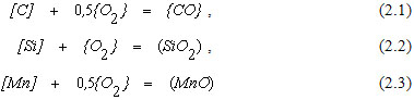 Реакции (2.1) – (2.3) являются сильными экзотермическими реакциями. В результате выделения большого количества тепла в ограниченном участке ванны первичная реакционная зона характеризуется высокими температурами, которые согласно данным различных исследователей могут достигать 2500 – 3000оС и более.