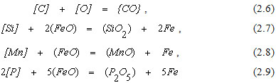 В первичной реакционной зоне газообразный кислород непосредственно взаимодействует с жидким металлом. При этом в первую очередь окисляются примеси, обладающие наиболее высоким химическим сродством к кислороду, по реакциям и др., которые принято называть реакциями прямого окисления.