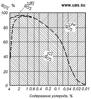 После окисления марганца и кремния основное количество вдуваемого в ванну кислорода расходуется на окисление углерода. Эта реакция остается ведущей до достижения остаточного содержания углерода 0,05%. Вместе с тем при концентрации углерода в менее 0,2 – 0,3% быстро увеличивается доля кислорода, который расходуется на окисление железа. При этом скорость окисления углерода снижается, а концентрация оксидов железа в шлаке и содержание растворенного в металле кислорода увеличиваются.