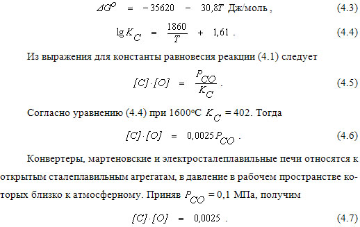 Последнее уравнение может быть использовано для определения равновесных соотношений между концентрациями углерода и кислорода в жидком железе при содержании углерода от 0,05 до 1,2 – 1,5%.