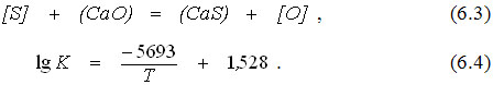 Из уравнения (6.4) следует, что реакция (6.3) является сильной эндотер-мической реакцией, протеканию которой в направлении образования сульфида кальция способствуют высокие температуры заключительного периода плавки. Кроме того, образованию сульфида кальция по реакции (6.3) будут способствовать высокая основность шлака, малая активность растворенного в металле кислорода и оксидов железа в шлаке.