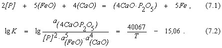 Характер совместного влияния содержания CaO и FeO в шлаке на величину коэффициента распределения фосфора поясняется рисунком 7.1. Из рисунка видно, что при высокой основности шлака коэффициент распределения фосфора между шлаком и металлом может превышать 300. Это означает, что при высоких температурах дефосфорация металла может быть не менее эффективной, чем при использовании теплового удара.