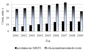 В последние два десятилетия технология непрерывной разливки стали во многом повлияла на развитие отечественного сталеплавильного комплекса. Это, прежде всего, относится к модернизации конвертерных цехов Украины. Процесс непрерывной разливки, являющийся стержневым элементом в построении типа «мини-завод», безусловно, способствует появлению новых металлургических предприятий небольшой мощности в Украине. Динамика увеличения объемов стали, разливаемой на МНЛЗ, представлена на рисунке 6.25.