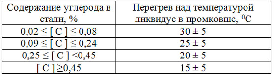 Таблица 7.2 – Перегрев над температурой ликвидус в промковше