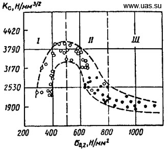 Рисунок 7.2 – Зависимость параметра трещиноустойчивости Кс от предела текучести o0,2 литых сталей: I – вязкое разрушение; II – вязко-хрупкое разрушение; III – хрупкое разрущение