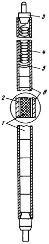 Рисунок 9.2 – Размещение топлива в тепловыделяющем элементе для промышленных станций с реактором типа LWR: 1 – топливная таблетка; 2 – газовый зазор; 3 – заглушка; 4 – пружина; 5 – изолятор; 6 – оболочка
