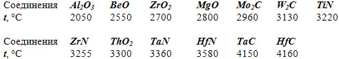 В современной технологии достигают все больших температур, что требует создания материалов термостойких и шлакоустойчивых при температурах, значительно превышающих 2000oС. Для получения таких огнеупоров используют целый ряд чистых оксидов металлов, а также карбиды и нитриды некоторых элементов. Ниже приводятся температура плавления таких соединений: цирконист