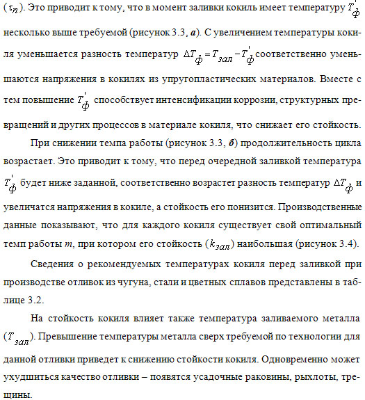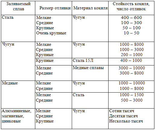 Стойкость кокилей и пути ее повышения. Данный показатель измеряется числом отливок требуемого качества, полученных в данном кокиле до выхода его из строя. Приблизительная стойкость кокилей приведена в таблице 3.1.