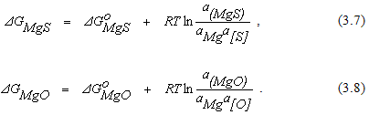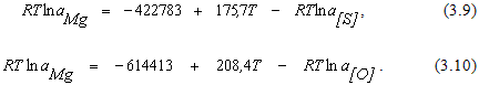 Если предполагать, что продуктами протекающих реакций являются чистые оксиды и сульфиды магния, тогда с учетом зависимостей (3.4) и (3.6) для равновесных условий уравнения (3.7) и (3.8) можно привести к виду:
