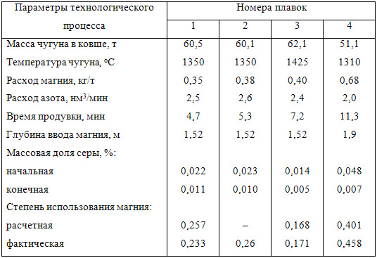 Анализ приведенных в таблице данных показывает, что с учетом точности определения степени использования магния для десульфурации чугуна в промышленных условиях совпадение расчетных и экспериментальных результатов можно считать вполне удовлетворительным.
