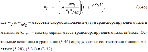 Для внедоменной десульфурации чугуна при подготовке к сталеплавильному переделу широко используется инжектирование гранулированного магния в расплав через погружаемые фурмы с испарительными камерами. В этом случае внутри испарительной камеры транспортирующий газ смешивается с паром магния, и в обрабатываемый металл поступает смесь парообразного десульфуратора и газа. При характерных для промышленных установок параметрах процесса десульфурации влияние нейтрального по отношению к реагенту транспортирующего газа на эффективность использования магния для десульфурации чугуна с достаточной точностью позволяет оценить зависимость