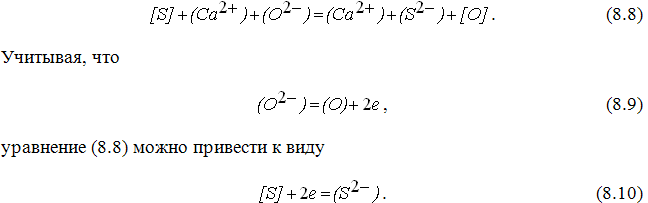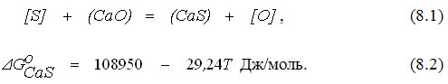 Из уравнения (8.2) видно, что реакция (8.1) является сильной эндотермической реакцией. Протеканию ее в сторону образования сульфида кальция способствуют: высокая температура, высокая основность шлака, а также низкая активность растворенного в металле кислорода и малое содержание оксидов железа в контактирующем с металлом шлаке.