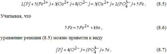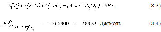 Из уравнения (8.4) видно, что реакция (8.3) является сильной экзотермической реакцией. Протеканию ее в сторону образования фосфата кальция способствуют: низкая температура, высокая основность шлака и наличие в нем большого количества оксидов железа.