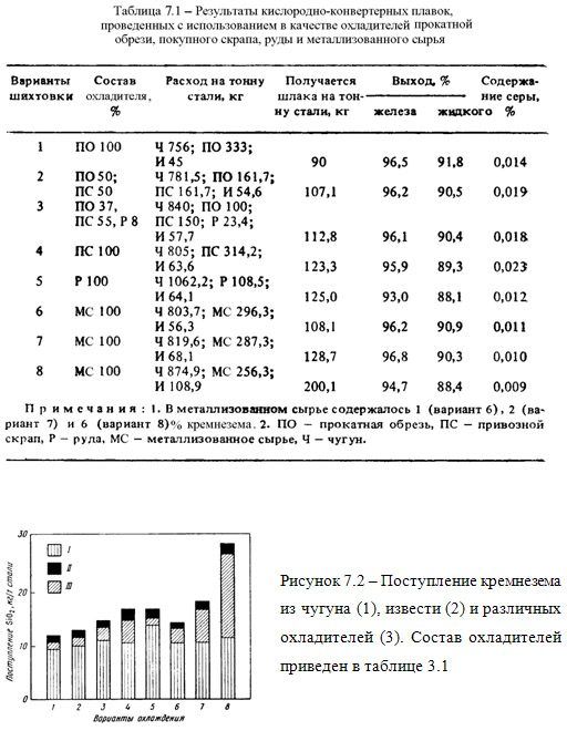Вместо скрапа в конверторном процессе в качестве чистого охладителя может применяться руда. Она содержит небольшие количества вредных примесей, однородна по химическому составу. Но вследствие ее высокого охлаждающего эффекта и низкого содержания в ней железа применение руды вызывает увеличение расхода чугуна, а с технологической точки зрения – увеличение вероятности выбросов и снижения выхода годного. Эти обстоятельства и обусловили интерес к металлизованному сырью как возможному охладителю в кислородно-конвертерном процессе.
