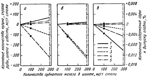 При введении 100 кг губчатого железа вместо руды количество ее необходимо уменьшить на 38 кг, а чугуна – на 84 кг на 1 т жидкой стали. Количество извести и шлака, а также содержание серы в стали при этом остаются практически неизменными.