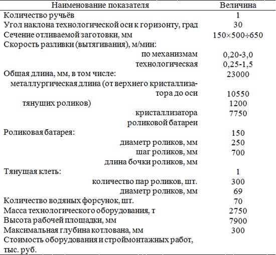 Таблица 1. Основные характеристики опытной НП МНЛЗ