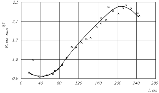 Коэффициент затвердевания стали определяли в соответствии с формулой (1). В качестве примера на рис. 5 показано изменение коэффициента затвердевания (К) по высоте действия струйно-циркуляционных потоков. Как видно из приведенных данных, величина К в зоне действия струи изменяется от примерно 1,0 до 2,5 см/мин.