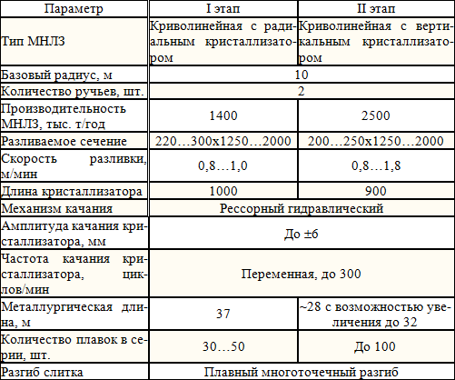 Развитием работ по созданию высокоэффективным слябовых МНЛЗ стал проект вертикальной слябовой МНЛЗ для ККЦ-1 ОАО «Новолипецкий металлургический комбинат» (табл.2).
