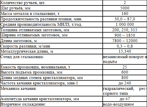 Таблица 2. Технические параметры вертикальной МНЛЗ