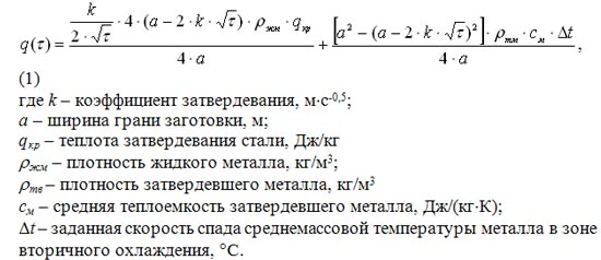 В работе [1] авторами предложен вариант аналитического способа для определения оптимального распределения интенсивности вторичного охлаждения. Его суть заключается в том, что плотность теплового потока, отводимого от поверхности расчетного сечения заготовки в каждый момент времени, должна равняться сумме теплового потока, выделяющегося на фронте затвердевания и теплового потока, соответствующего охлаждению уже затвердевшего массива металла с заданной скоростью.