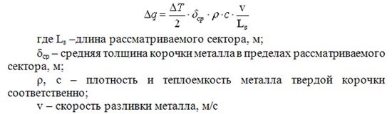 – на основании величины разности измеренной и заданной температур () из рассмотрения теплового баланса корочки затвердевшего металла в пределах рассматриваемого сектора определяем корректирующую плотность теплового потока:
