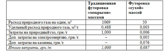 Таблица 2 - Сравнение затрат при изготовлении рабочей футеровки промежуточных ковшей по традиционной и внедренной технологии (на один промежуточный ковш емкостью 43 т)