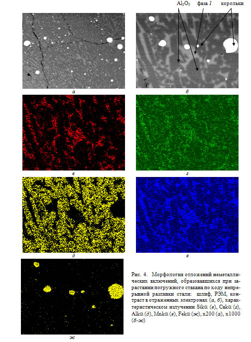 3. Отложения неметаллических включений, образовавшиеся при зарастании погружного стакана, представлены тремя основными фазами (рис. 1, 3, 4):
