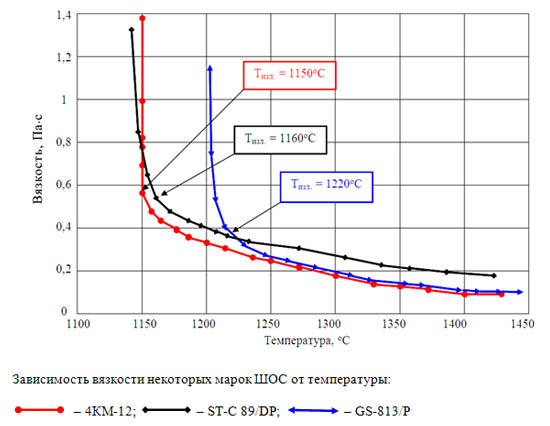 На рисунке приведена зависимость вязкости шлаков основных от температуры ШОС, применяющихся при разливке низко- (смесь марки SТ-С89/DP) и среднеуглеродистых сталей (смесь GS-813/P) и опытной смеси 4КМ-12, которая показывает, что по технологическим свойствам смесь марки 4КМ-12 может применяться при разливке как низко- (< 0,06 % С), так и среднеуглеродистых сталей (< 0,30 % С), что и было подтверждено на практике.