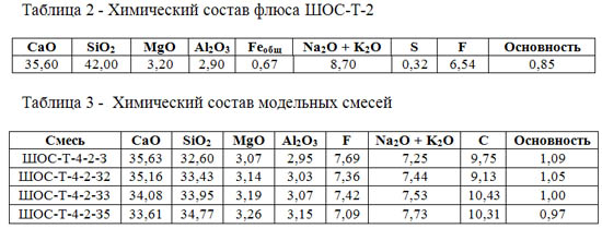 На основании ранее проведенных исследований для определения коэффициентов вязкости были выбраны базовый флюс ШОС-Т-2 с основностью 0,85 (химический состав молотого флюса ШОС-Т-2 приведен в табл. 2) и модельные смеси ШОС-Т-4-2, некоторые из которых приведены в табл. 3.