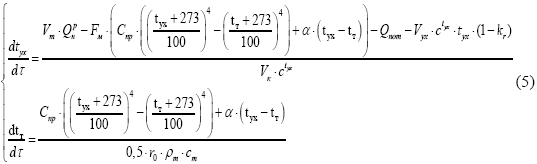 Эта модель включает в себя два дифференциальных уравнения 1-го порядка. Первое описывает изменение температуры продуктов сгорания, заполняющих камеру печи, причем тепловой поток, падающий на поверхность материала, представлен как сумма двух составляющих: лучистой и конвективной, определяемых в каждый момент времени в зависимости от текущей температуры продуктов сгорания и температуры термически тонкого тела. Второе уравнение описывает нагрев термически тонкого тела цилиндрической формы.