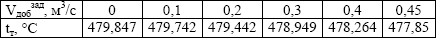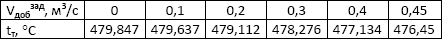 Исследования для закона изменения расхода топлива типа «включено-выключено» проводились для базовой составляющей расхода топлива 0,45 м3/с, частоты колебаний 0,05 Гц. Получены следующие значения температуры материала в конце нагрева для разных значений добаовчной составляющей расхода топлива (табл. 3, рис. 3)