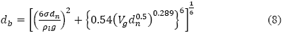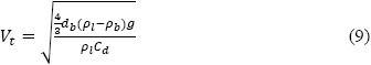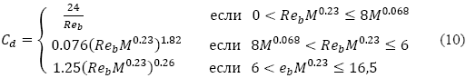 где db – диаметр пузырька, м; pi – плотность жидкости, кг/м3; pb – плотность пузырька, кг/м3; Cd – коэффициент лобового сопротивления пузырька.