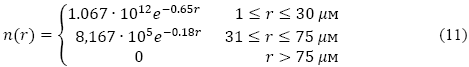 На основе анализа результатов измерений распределения включений по размерам, были предложены следующие формулы для расчёта начально распределения включений по размерам: