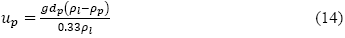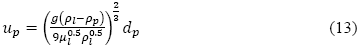 Однако, при числах Рейнольдса превышающих 0,5, скорости всплывания частиц начинают отличаться от полученных при расчёте по закону Стокса на 5 и более процентов [11]. При числах Рейнольдса включения от 0,5 до 1000 скорость всплывания включения можно рассчитать по формуле [3]: