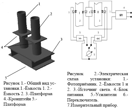 Особенностью установки является то, что в её составе две одинаковые рабочие ёмкости. Одна ёмкость является исследовательской, вторая – сравнительной. Это необходимо для того, чтобы автоматически исключалась случайная ошибка измерений из-за температуры, вибрации, а в нашем случае и дополнительная внешняя освещённость.
