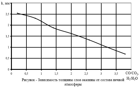 В данной статье предложен способ снижения окалинообразованя путем сжигания топлива с коэффициентом расхода воздуха б > 1. Такое сжигании топлива позволяет создать нейтральную или востоновительную атмосферы в рабочем пространстве печи, что позволяет снизить концентрацию окислительных газов (Н2О,СО2,О2), а следовательно и их влияние на нагреваемый металл, и повысить концентрацию восстановительных газов (СО, Н2). В ходе исследований были выполнены расчеты и получены данные, отражающие зависимость толщины образовавшегося слоя окалины от состава печной атмосферы. Данные представлены на рисунке.