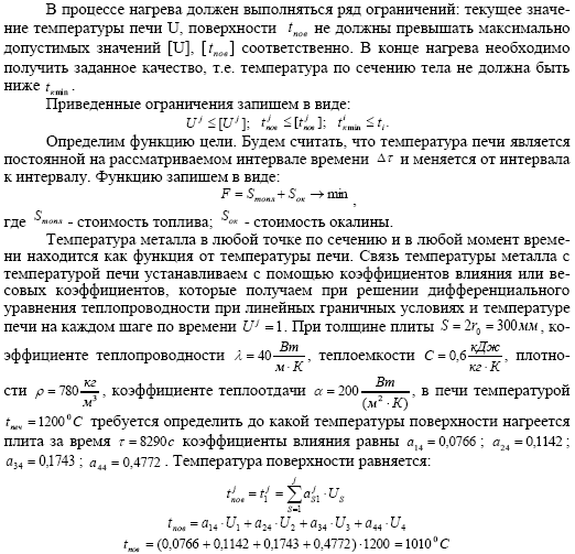 Основной задачей нагревательных печей является обеспечение стана нагретым металлом. В тех случаях, когда печи не являются узким местом в звене печь-стан, нагрев металла желательно вести по таким критериям как минимум стоимости на затраченное топливо и минимум стоимости образовавшейся окалины.