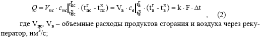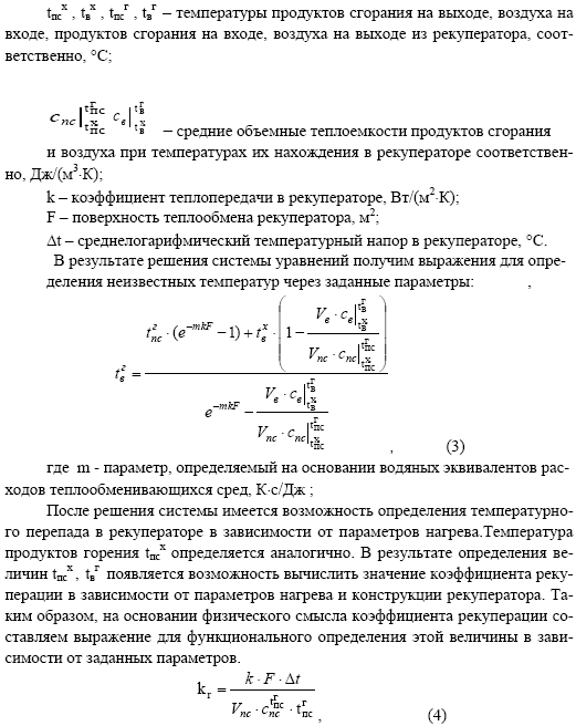 Значительное влияние на средневзвешенный коэффициент использования топлива оказывает коэффициент рекуперации. Для анализа влияния различных факторов на величину коэффициента рекуперации предложена аналитическая методика, базирующаяся на уравнениях теплового баланса и теплопередачи в рекуператоре: