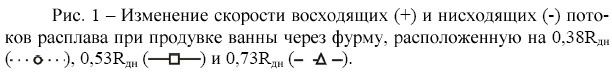 На рис. 1 приведена зависимость вертикальной составляющей скорости потоков расплава в конической ванне при квазистационарном перемешивании от интенсивности продувки аргоном.