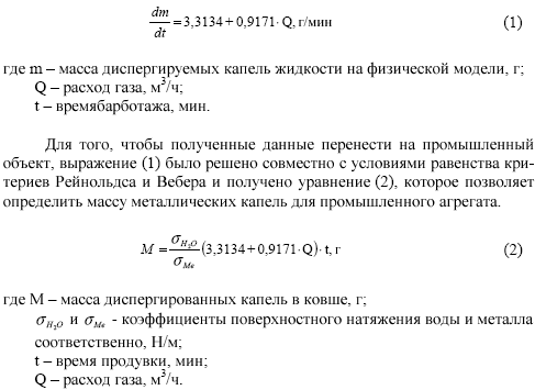После обработкиэкспериментальных данных было получено выражение (1), которое позволяет определить массу капель диспергируемых с поверхности ванны модели в единицу времени от расхода вдуваемого газа: