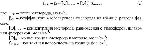 Растворимость кислорода в твердом железе и сплавах на его основе очень мала, в результате металл при обычных температурах, как правило, оказывается пересыщенным кислородом. Для предотвращения этого явления на заключительной стадии сталеплавильного процесса проводят раскисление стали. Содержание растворенного в жидком металле кислорода при этом уменьшается и химический потенциал кислорода в металле (MО2 или р02 равновесное) становится значительно ниже химического потенциала кислорода в контактирующих с металлом фазах-атмосфере, окислительном шлаке, а в ряде случаев – даже огнеупорной футеровке. В результате устанавливается процесс перехода кислорода из этих фаз в объем металла. Поток кислорода, поступающий в металл, в общем виде определяется уравнением: