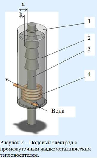 В связи с этим актуальной проблемой является организация более эффективной, чем теплопроводность, конвективной теплопередачи в подовом электроде. Разработан подовый электрод ДСППТ с промежуточным жидкометаллическим теплоносителем (рис. 2). Он включает стальной кожух (1) с полостью (2), заполненной теплоносителем. В полости установлен центральный стальной стержень (3) с изменяющимся по продольной оси поперечным сечением. Тепловой поток отводится охлаждающей водой посредством змеевика (4), установленного в полости с промежуточным теплоносителем.