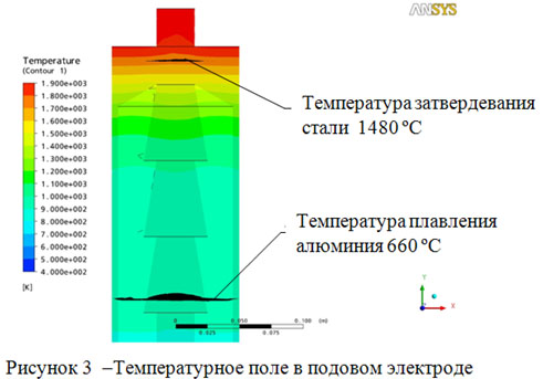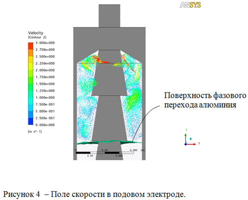 Полученные результаты показывают, что жидкий алюминий, как промежуточный теплоноситель, обеспечивает перенос тепла от ме-таллической ванны в охлаждающей подовый электрод воде без существенного оплавления его стальной части. Поле скорости свидетельствует об интенсивном перемешивании жидкого теплоносителя в полости (до 3м/с), что превышает возможности тепловой конвекции с характерной скоростью до 0,2 м/с [5], которая имеет место при отсутствии электровихревого течения.